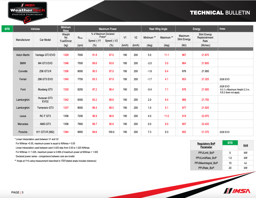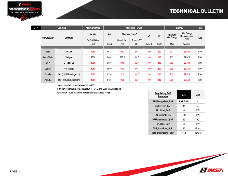 Najwięcej brwi podniosła waga obecnej specyfikacji Porsche 963, ważące aż 1100KG w ramach balansu po Sebring. Najbardziej lekkie samochody w obu klasach to Aston Martiny – Valkyrie i Vantage.